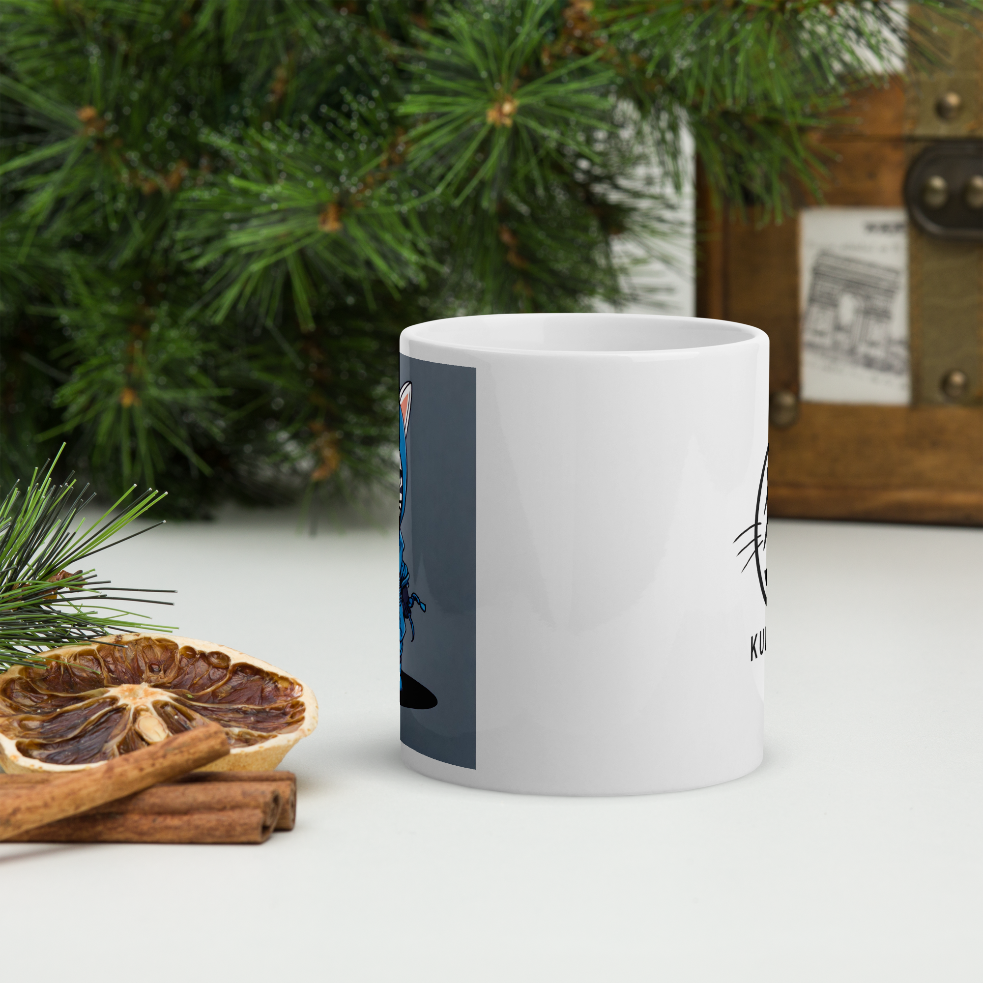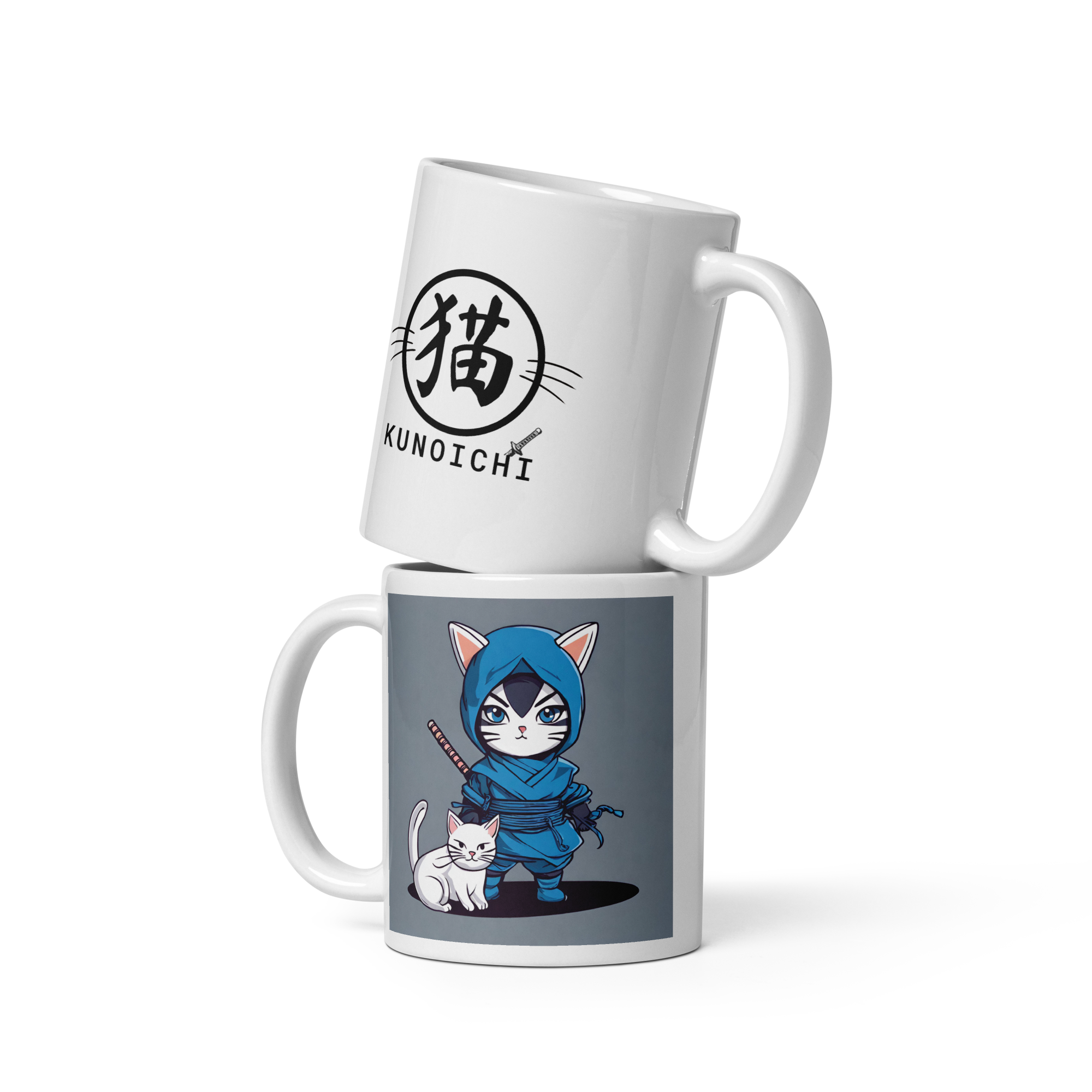 白を基調とした猫のくノ一をモチーフにした可愛らしいマグカップ。