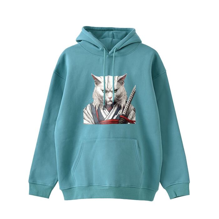 猫の侍がプリントされたこのパーカーは、世界に一つだけの個性的な一枚です。