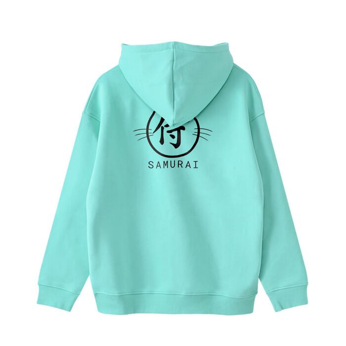 【ユニセックス】 猫柄パーカー おもしろパーカー 猫侍パーカー(エメラルドグリーン) Unisex Cat Samurai Hoodie (Emerald Green) 猫Tシャツ 猫グッズ