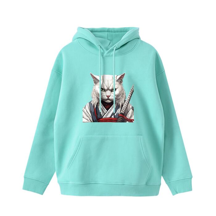 猫の侍がプリントされたこのパーカーは、世界に一つだけの個性的な一枚です。