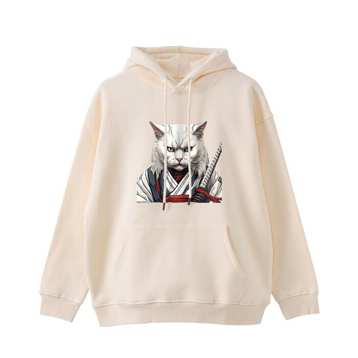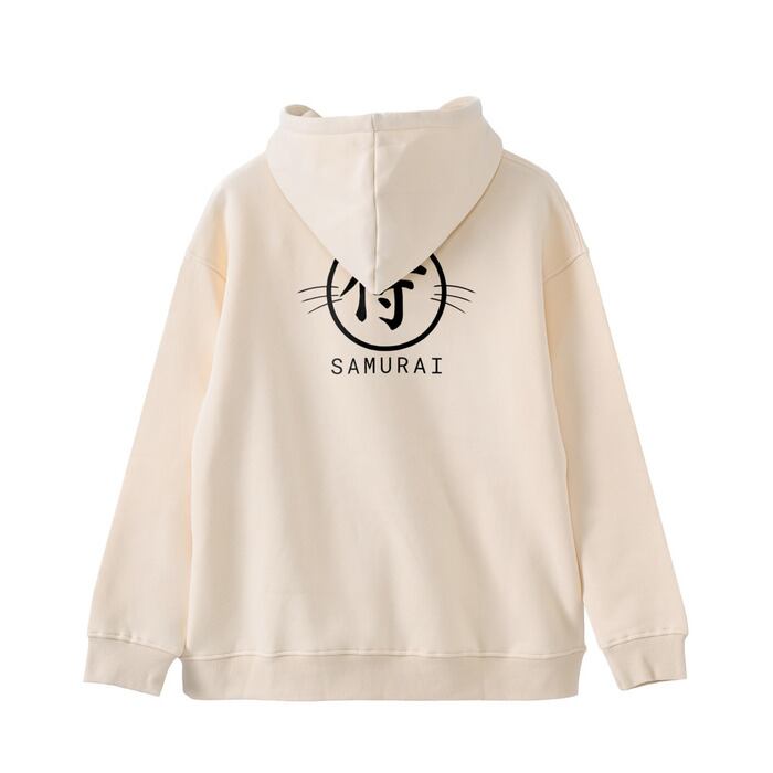 【ユニセックス】 猫柄パーカー おもしろパーカー 猫侍パーカー(アイボリー) Unisex Cat Samurai Hoodie (Ivory) 猫Tシャツ 猫グッズ