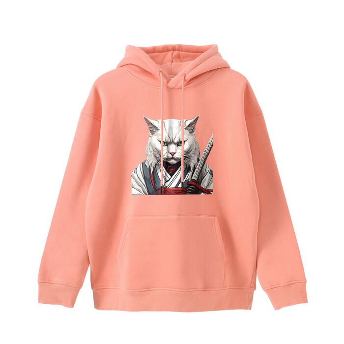 猫の侍がプリントされたこのパーカーは、世界に一つだけの個性的な一枚です。