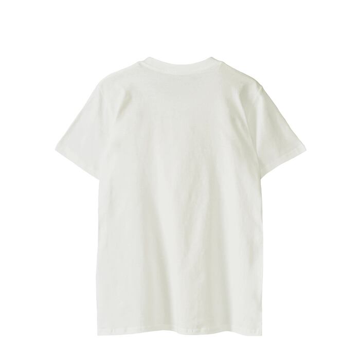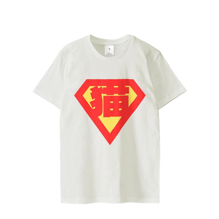 Tシャツ前面の胸元にスーパー〇ンぽい猫マークがプリントされています。