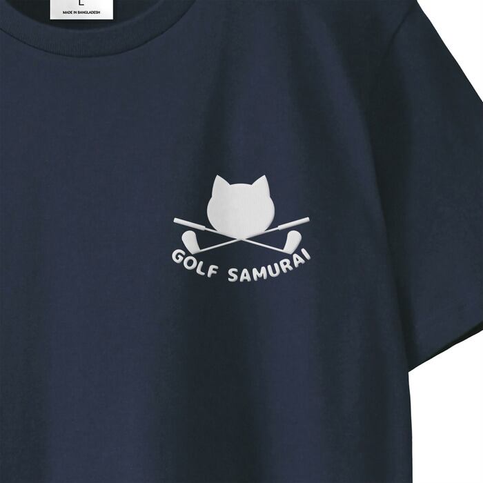 【ユニセックス】 GOLF SAMURAI Tシャツ 前面ロゴ 背面てくてく (ネイビー) 猫Tシャツ 猫グッズ