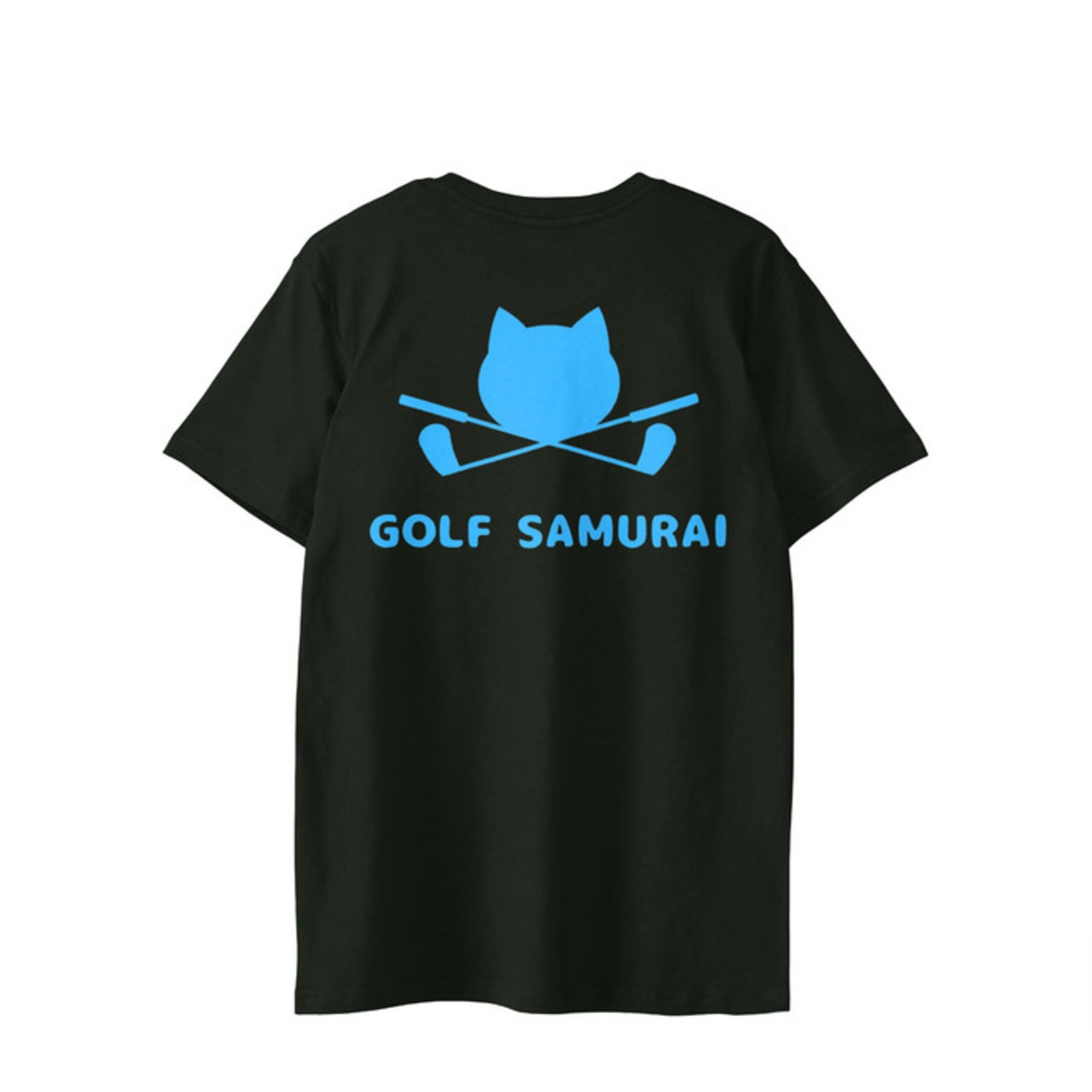 【ユニセックス】 GOLF SAMURAI Tシャツ (生地ブラック×文字ライトブルー) 猫Tシャツ 猫グッズ